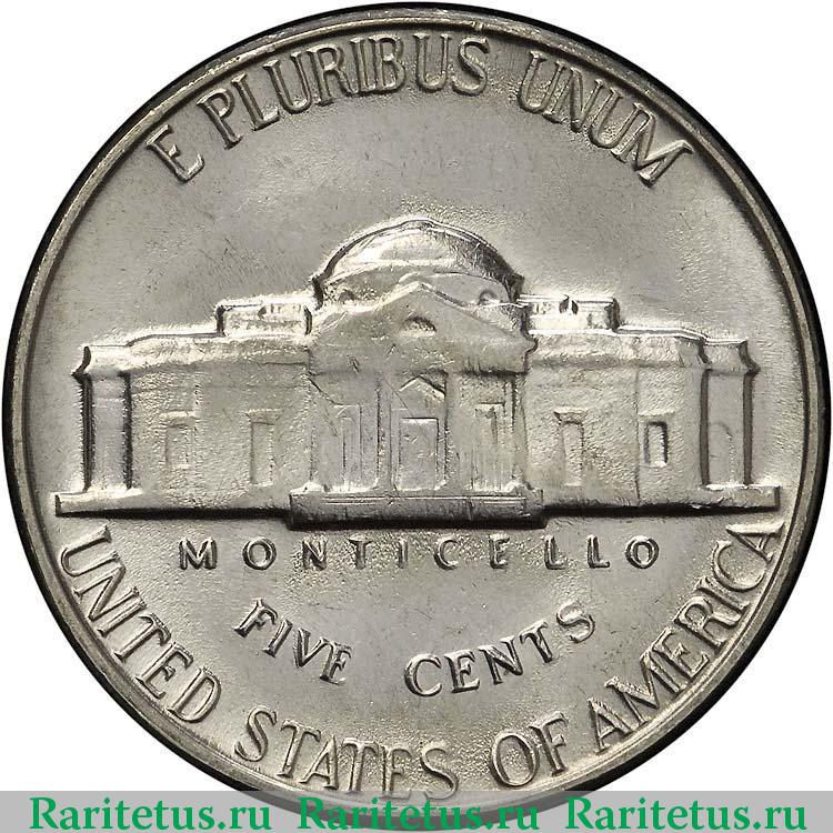 Изображение усадьбы Джефферсона Монтичелло (Monticello). Надписи: E PLURIBUS UNUM / MONTICELLO / FIVE CENTS / UNITED STATES OF AMERICA.