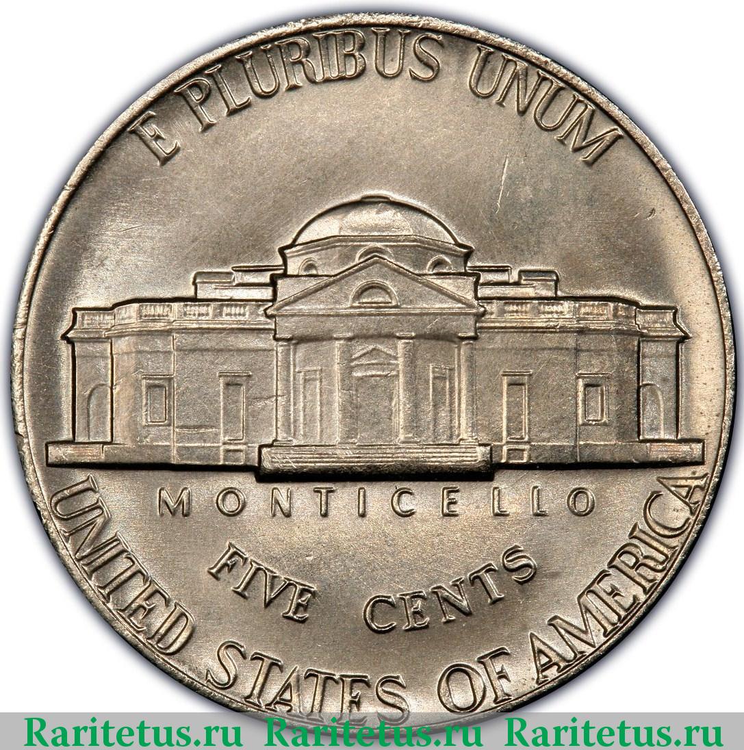 Изображение усадьбы Джефферсона Монтичелло (Monticello). Надписи: E PLURIBUS UNUM / MONTICELLO / FIVE CENTS / UNITED STATES OF AMERICA.