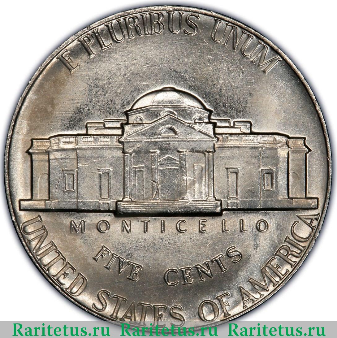 Изображение усадьбы Джефферсона Монтичелло (Monticello). Надписи: E PLURIBUS UNUM / MONTICELLO / FIVE CENTS / UNITED STATES OF AMERICA.