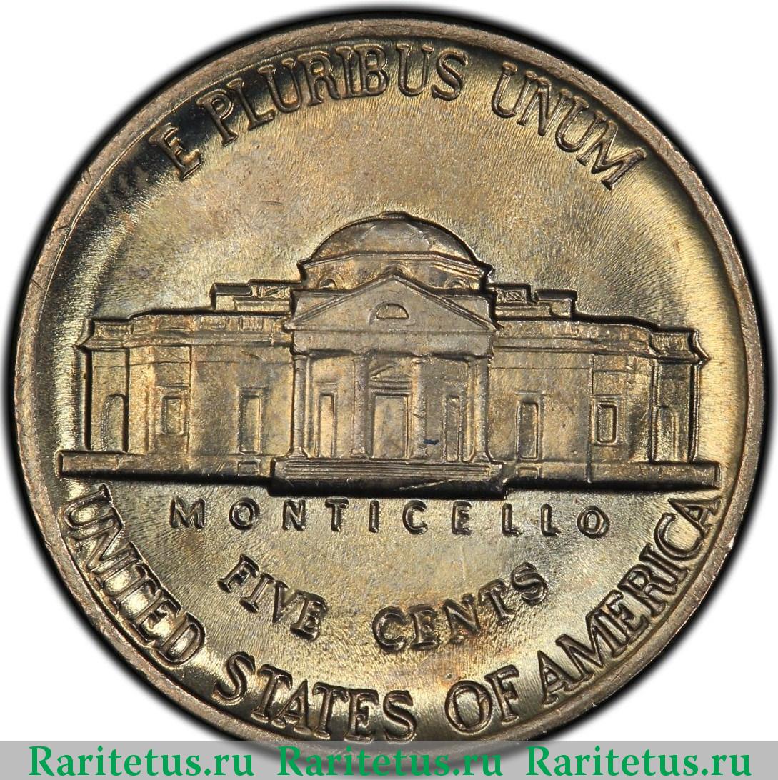 Изображение усадьбы Джефферсона Монтичелло (Monticello). Надписи: E PLURIBUS UNUM / MONTICELLO / FIVE CENTS / UNITED STATES OF AMERICA.