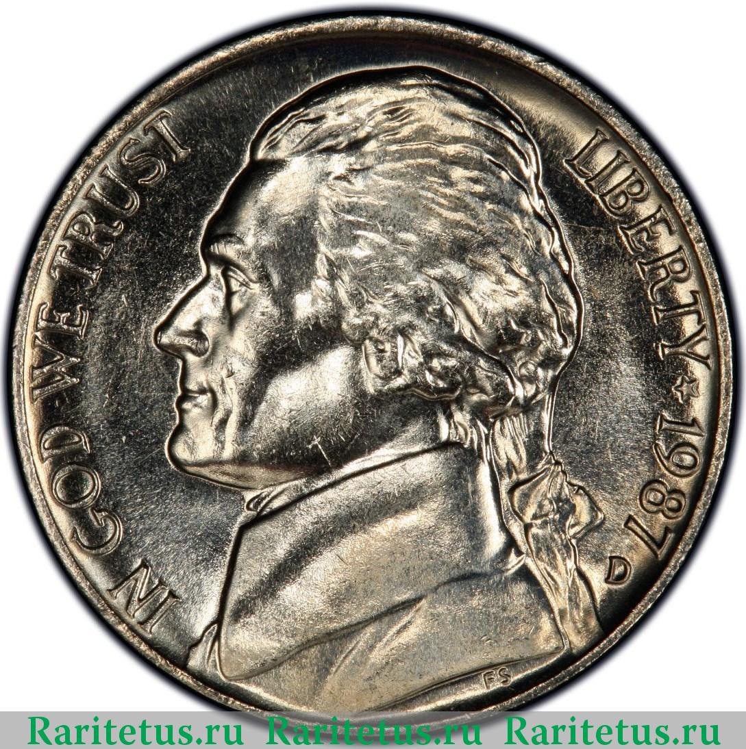 Аверс монеты 5 центов (cents) 1987 года D США