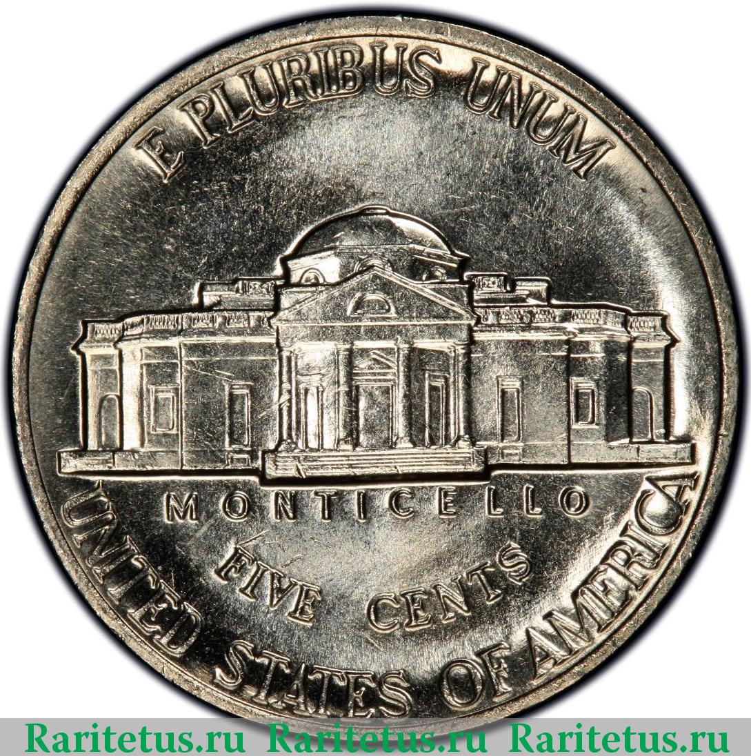 Изображение усадьбы Джефферсона Монтичелло (Monticello). Надписи: E PLURIBUS UNUM / MONTICELLO / FIVE CENTS / UNITED STATES OF AMERICA.