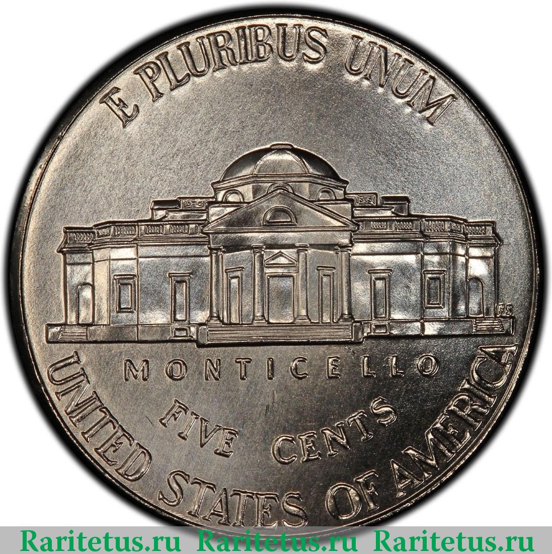 Изображение усадьбы Джефферсона Монтичелло (Monticello). Легенда: E PLURIBUS UNUM / MONTICELLO / FIVE CENTS / UNITED STATES OF AMERICA / FS.