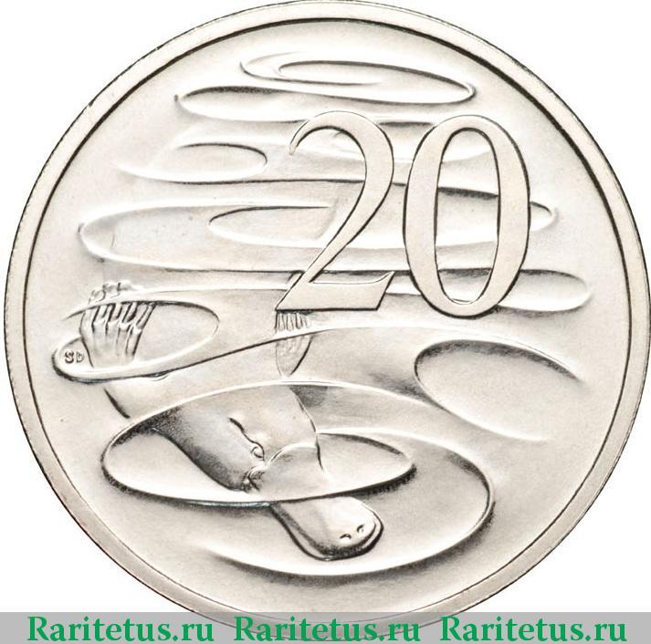 На фоне ряби воды изображен утконос и число «20». Слева от водоплавающего млекопитающего инициалы художника Stuart Devlin - «SD».