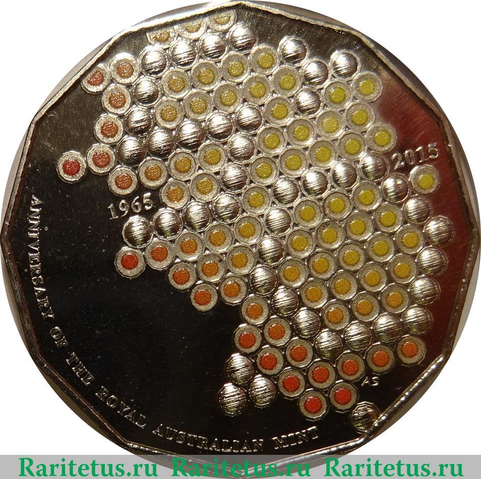 В центре цветное стилизованное изображение монет, выложенных в 13 рядов. Часть монет желтые, часть красные, часть золотые. Золотые монеты образуют число «50». Слева от монет год 1965, справа – 2015. В нижней части рисунка монограмма «AS». Слева и снизу надпись на английском языке: «ANNIVERSARY OF THE ROYAL AUSTRALIAN MINT», которая переводится как: «ЮБИЛЕЙ КОРОЛЕВСКОГО АВСТРАЛИЙСКОГО МОНЕТНОГО ДВОРА». В окружность канта вписан двенадцатиугольник.