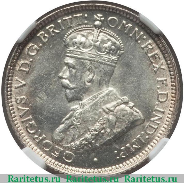 В центре профильный портрет влево императора Великобритании Георга V. Вдоль канта слева, сверху и справа надпись на латыни "GEORGIVS V D. G. BRITT: OMN: REX F. D. IND: IMP:", которая переводится как "ГЕОРГ V, божьей милостью король всех британцев и защитник веры. Король и император Индии". Снизу представлена рельефная точка. По окружности канта - рельефные элементы в виде зубцов.
