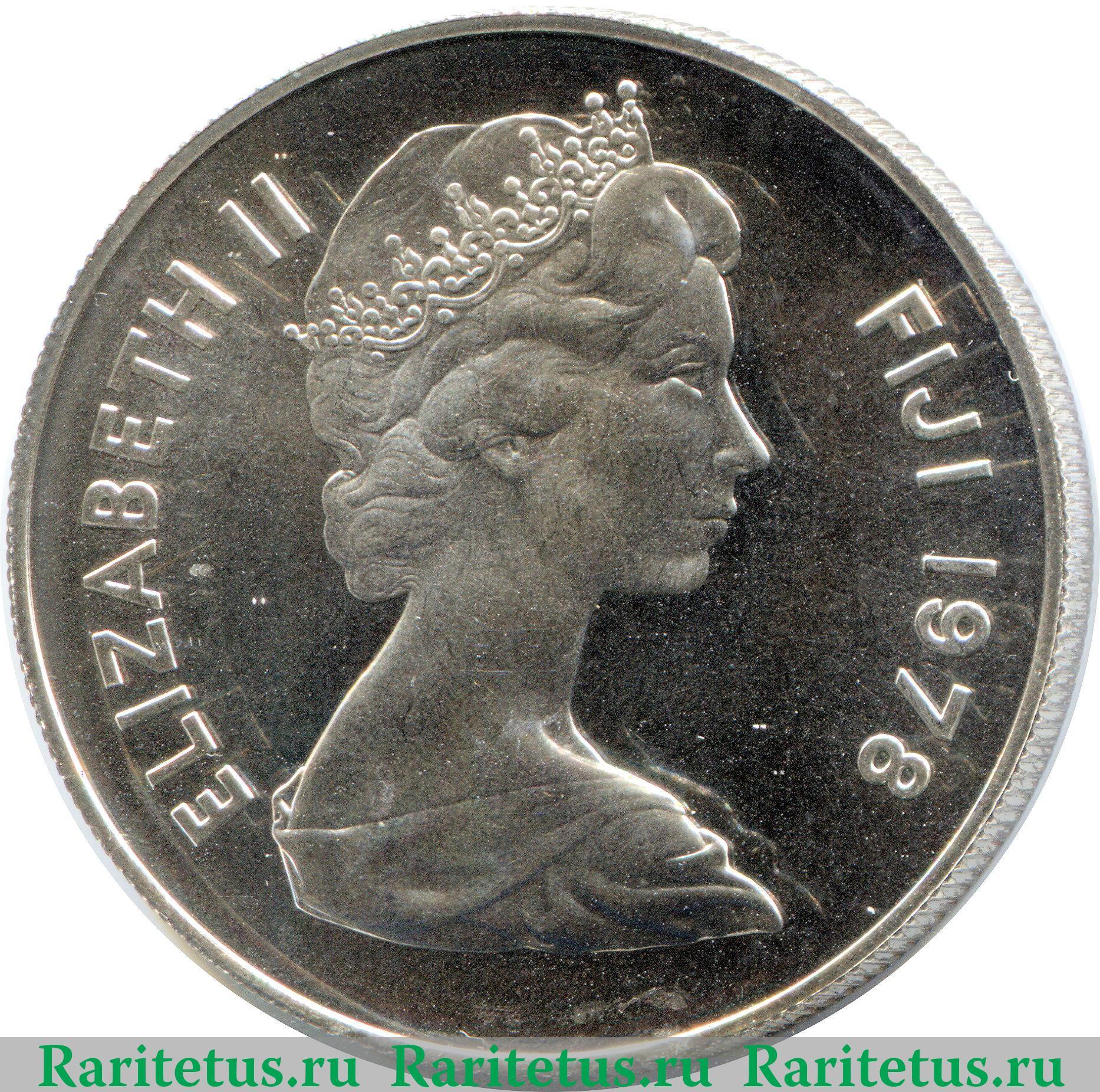 По центру расположен профильный портрет вправо королевы Великобритании Елизаветы II в короне. Вдоль канта надписи на английском языке: слева имя монарха «ELIZABETH II», справа название страны «FIJI» (Фиджи) и год выпуска «1978».