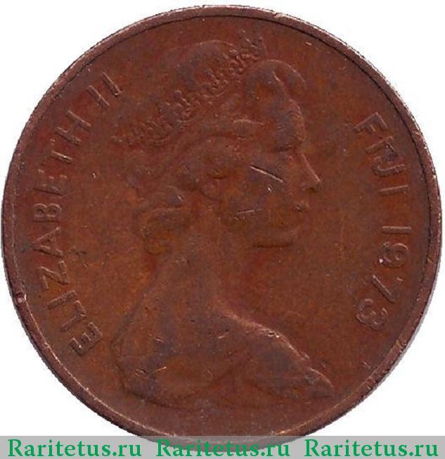 В центре расположен профильный портрет вправо королевы Великобритании Елизаветы II в короне. Слева вдоль канта имя монарха «Елизавета II» на английском языке «ELIZABETH II», справа название колонии «Фиджи» - «FIJI» и год выпуска «1973».
