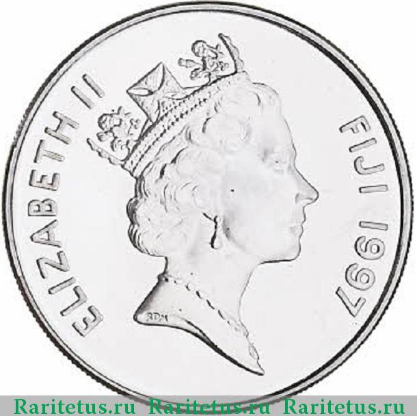 Слева вдоль канта надпись на английском языке «ELIZABETH II», переводится как «Елизавета II», справа – название страны Фиджи и год выпуска «FIJI 1997».