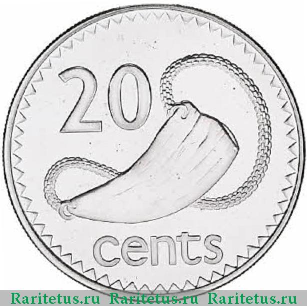 В центре церемониальный зуб кашалота (Tabua) и надпись в две строки «20 cents» — «двадцать центов».
