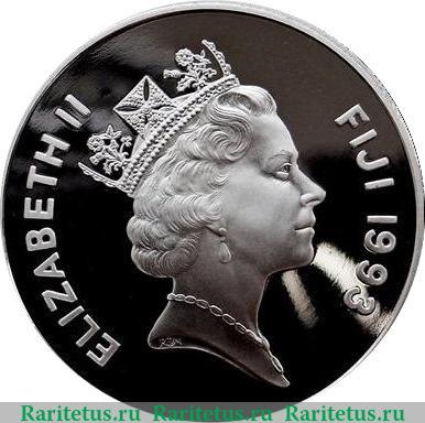 По центру расположен профильный портрет вправо королевы Великобритании Елизаветы II в короне, на шее ожерелье. В срезе инициалы британского скульптора Raphael David Maklouf - «RDM». Вдоль канта надписи на английском языке: слева имя монарха «ELIZABETH II», справа название страны «FIJI» (Фиджи) и год выпуска «1993».
