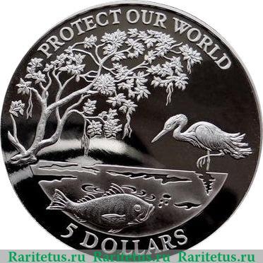 Изображены: снизу на фоне воды рыба вправо, справа, стоя на одной ноге рифовая цапля влево, слева ветвь дерева, листвой нависает над водной гладью. Вдоль канта надписи на английском языке: сверху «PROTECT OUR WORLD» (Защитим наш мир), снизу «5 DOLLARS» (5 Долларов).