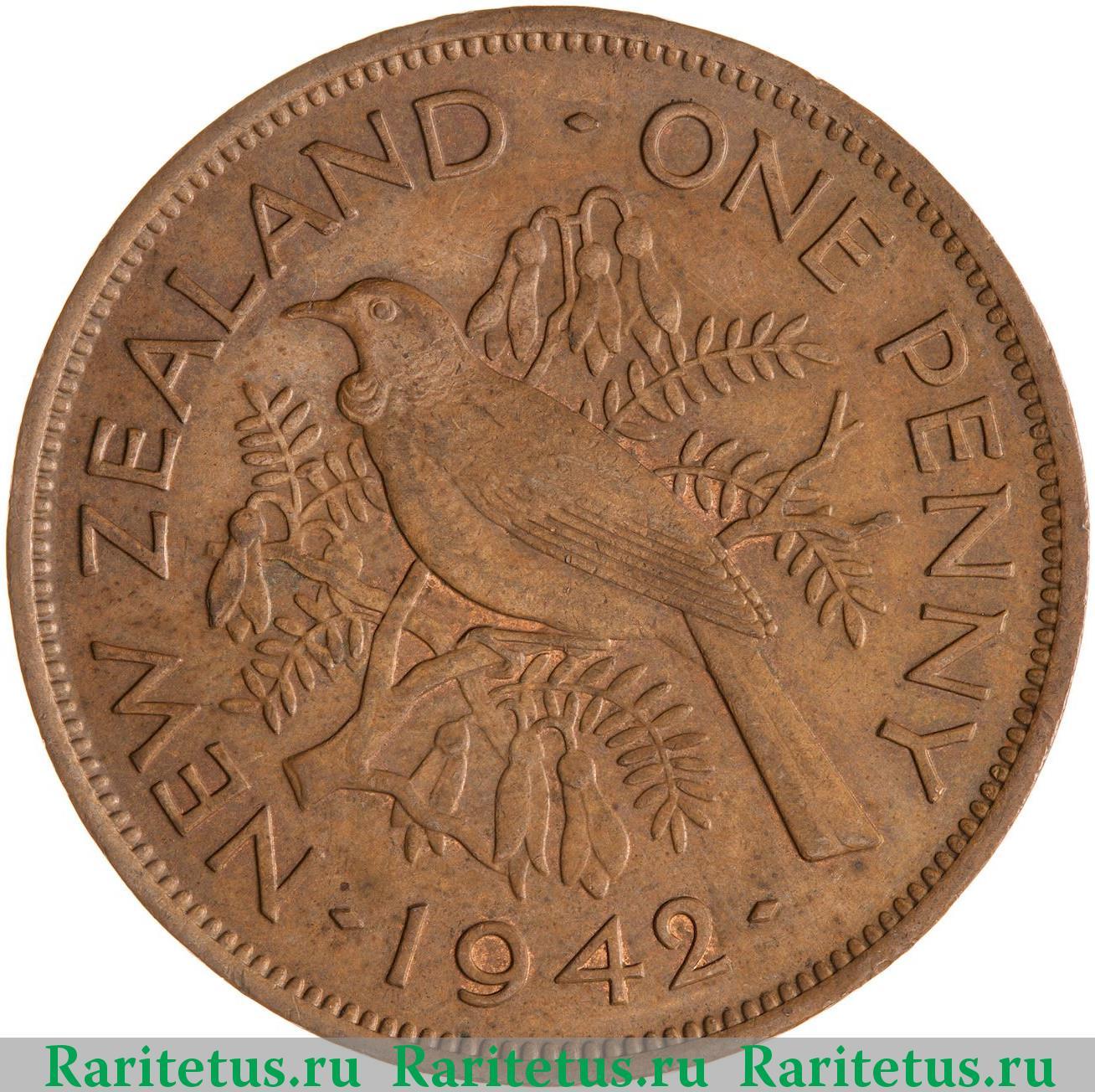 Сверху вдоль канта слева направо название страны «NEW ZEALAND» и надпись на англ. языке «ONE PENNY». которая переводится как «Один пенни». Снизу год выпуска «1942». В центре изображение птицы туи, сидящей на ветке.