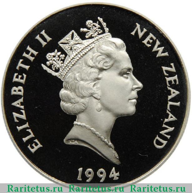 В центре профильный портрет вправо королевы Великобритании Елизаветы II в короне. Вдоль канта, слева, расположена надпись на английском "ELIZABETH II", которая переводится как "Елизавета II" - имя королевы, а справа надпись "NEW ZEALAND" - "Новая Зеландия" - название страны. Под обрезом шеи представлены буквы "RDM", обозначающие инициалы художника Raphael David Maklouf. Вдоль канта, снизу, представлены цифры "1994" - обозначение даты выпуска.