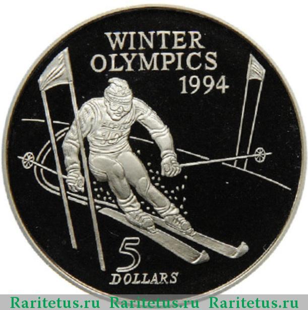 В центре представлено рельефное изображение спускающегося горнолыжника, расположенного между двумя флажками для слалома. В руках имеются лыжные палки. Под правым флажком рельефное дугообразное изображение черты. Позади горнолыжника расположен коллаж - в виде лыжни и рассыпающегося в стороны снега. Вдоль канта, сверху, надпись в три строки "WINTER OLIMPICS 1994", которая в переводится с английского как "Зимняя Олимпиада 1994". Цифры "1994" обозначают дату проведения Олимпиады. Вдоль канта, снизу, исполнена надпись в две строки "5 dollars", которая переводится с английского как "5 долларов".