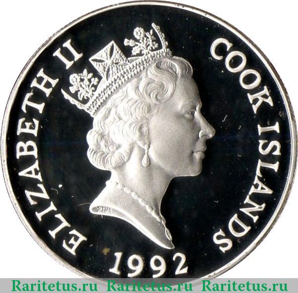 В центре профильный портрет королевы Елизаветы II, обращённый вправо. На срезе шеи портрета монограмма «RDM» - гравера Рафаэля Давида Маклуфа (Raphael David Maklouf). Слева и справа вдоль канта надписи на английском языке: «ELIZABETH II», которая переводится, как «Елизавета II», и «COOK ISLANDS», в переводе: «Острова Кука». Снизу вдоль канта год выпуска 1992.