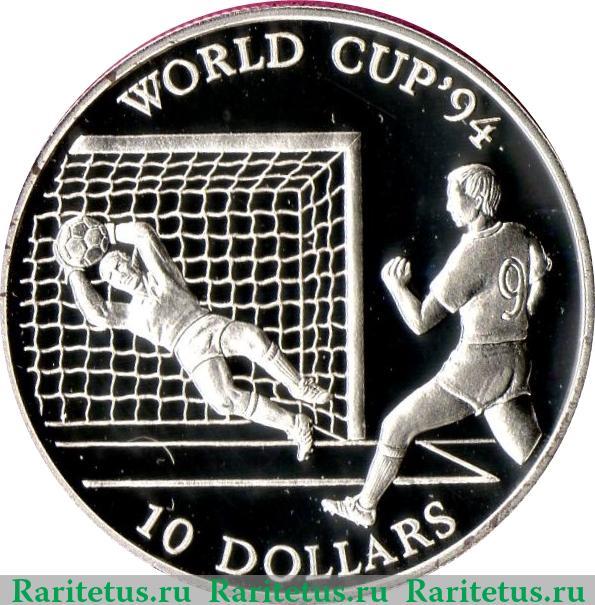В центре изображение эпизода футбольного матча: нападающий игрок, произведший удар по воротам, и вратарь, поймавший мяч. Сверху вдоль канта надпись: «Мировой чемпионат 1994 г.», на англ. яз. «WORLD CUP'94». Снизу вдоль канта надпись на англ. языке: «10 DOLLARS» - 10 долларов.