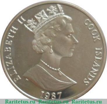 В центре профильный портрет королевы Елизаветы II, обращённый вправо. Под срезом шеи монограмма монетного двора Побджой в г. Тэдворс «РM». Слева и справа вдоль канта надписи на английском языке: «ELIZABETH II», которая переводится, как «Елизавета II», и «COOK ISLANDS», в переводе: «Острова Кука». Снизу у канта год выпуска 1987.