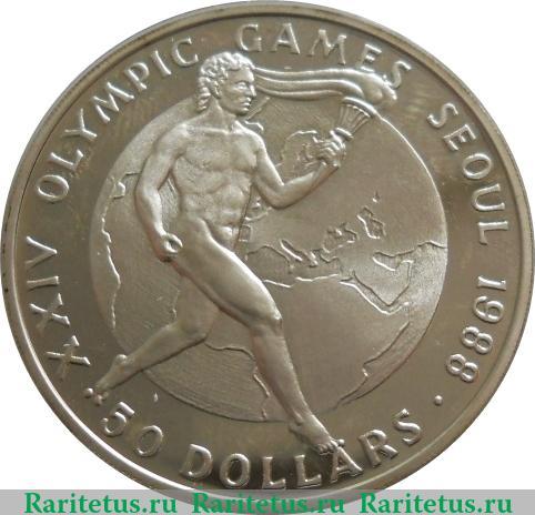 В центре изображение обнаженного мужчины бегущего с олимпийским факелом на фоне глобуса Земли. Слева, сверху и справа вдоль канта надпись: «XXIV Олимпийские игры в Сеуле 1988 г.», на англ. яз. «XXIV OLYMPIC GAMES SEOUL 1988». Снизу вдоль канта, отделенная точками, надпись на англ. языке: 50 DOLLARS.» - 50 долларов.