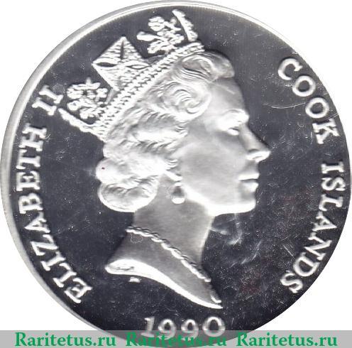 В центре профильный портрет королевы Елизаветы II, обращённый вправо. На срезе шеи портрета монограмма «RDM» - гравера Рафаэля Давида Маклуфа (Raphael David Maklouf). Под срезом шеи портрета монограмма монетного двора Побджой «РM». Слева и справа вдоль канта надписи на английском языке: «ELIZABETH II», которая переводится, как «Елизавета II», и «COOK ISLANDS», в переводе: «Острова Кука». Снизу вдоль канта год выпуска 1990.
