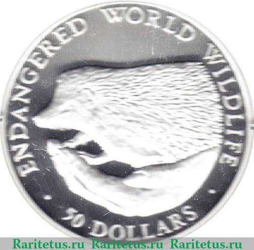 В центре изображение ежа на человеческой ладони. Слева, сверху и справа вдоль канта надпись: «Исчезающие в мире виды животных», на англ. яз. «ENDANGERED WORLD WILDLIFE». Снизу вдоль канта, отделенная точками, надпись на англ. языке: «50 DOLLARS» - 50 долларов.