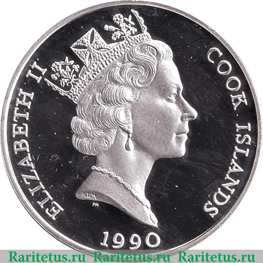 В центре профильный портрет королевы Елизаветы II, обращённый вправо. На срезе шеи портрета монограмма «RDM» - гравера Рафаэля Давида Маклуфа (Raphael David Maklouf). Под срезом шеи портрета монограмма монетного двора Побджой «РM». Слева и справа вдоль канта надписи на английском языке: «ELIZABETH II», которая переводится, как «Елизавета II», и «COOK ISLANDS», в переводе: «Острова Кука». Снизу вдоль канта год выпуска 1990.