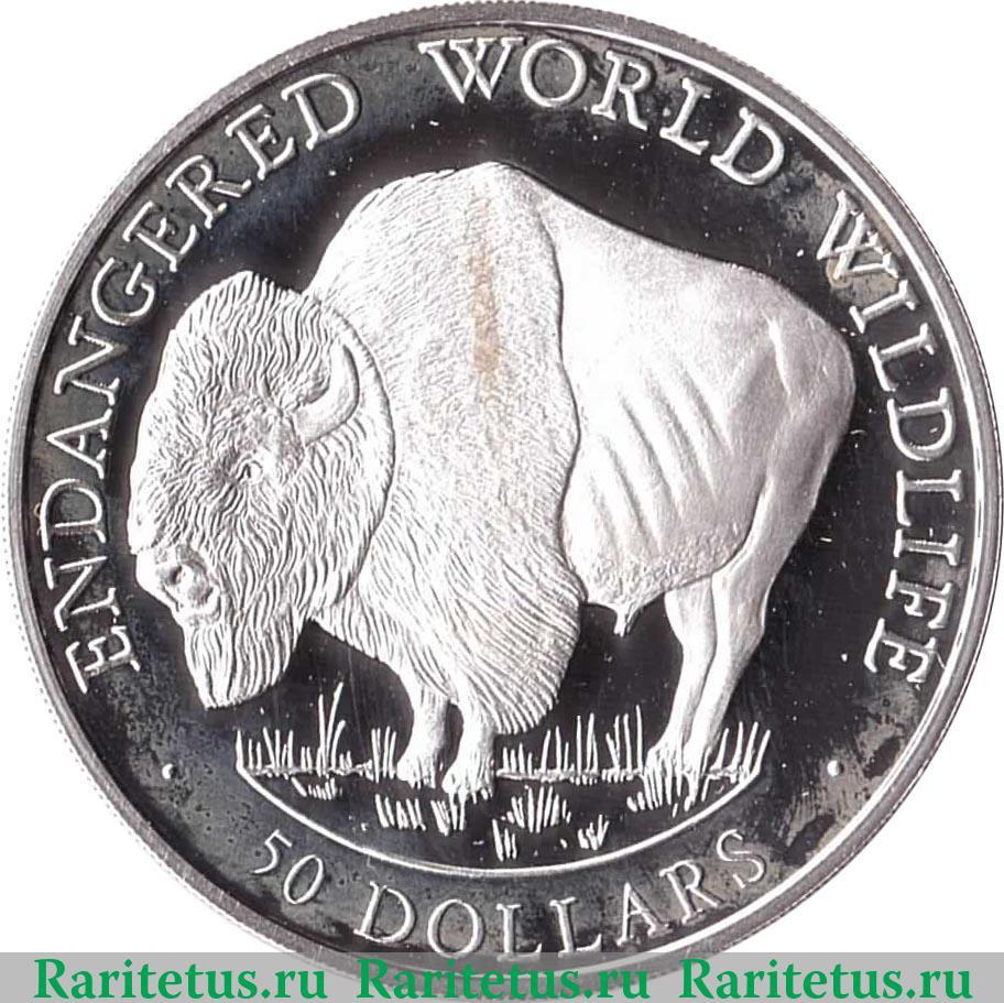 В центре изображение бизона влево. Слева, сверху и справа вдоль канта надпись: «Исчезающие в мире виды животных», на англ. яз. «ENDANGERED WORLD WILDLIFE». Снизу вдоль канта, отделенная точками, надпись на англ. языке: «50 DOLLARS» - 50 долларов.