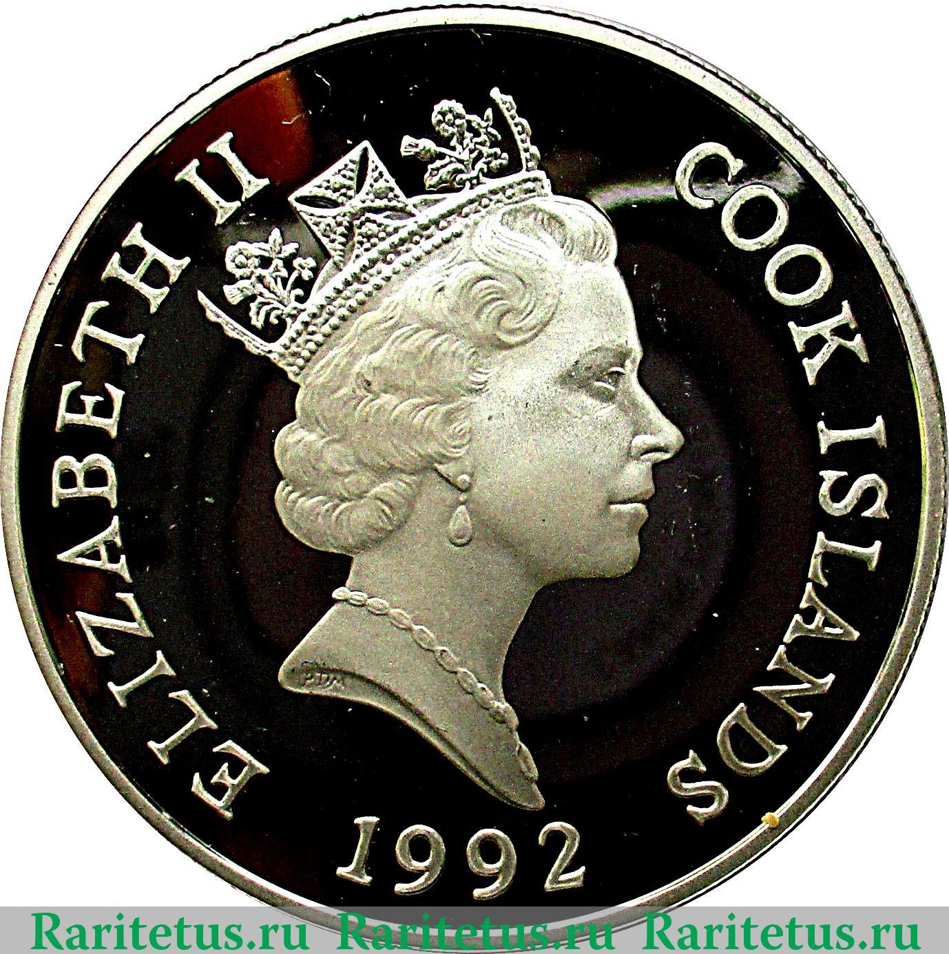 В центре профильный портрет королевы Елизаветы II, обращённый вправо. На срезе шеи портрета монограмма «RDM» - гравера Рафаэля Давида Маклуфа (Raphael David Maklouf). Слева и справа вдоль канта надписи на английском языке: «ELIZABETH II», которая переводится, как «Елизавета II», и «COOK ISLANDS», в переводе: «Острова Кука». Снизу вдоль канта год выпуска 1992.