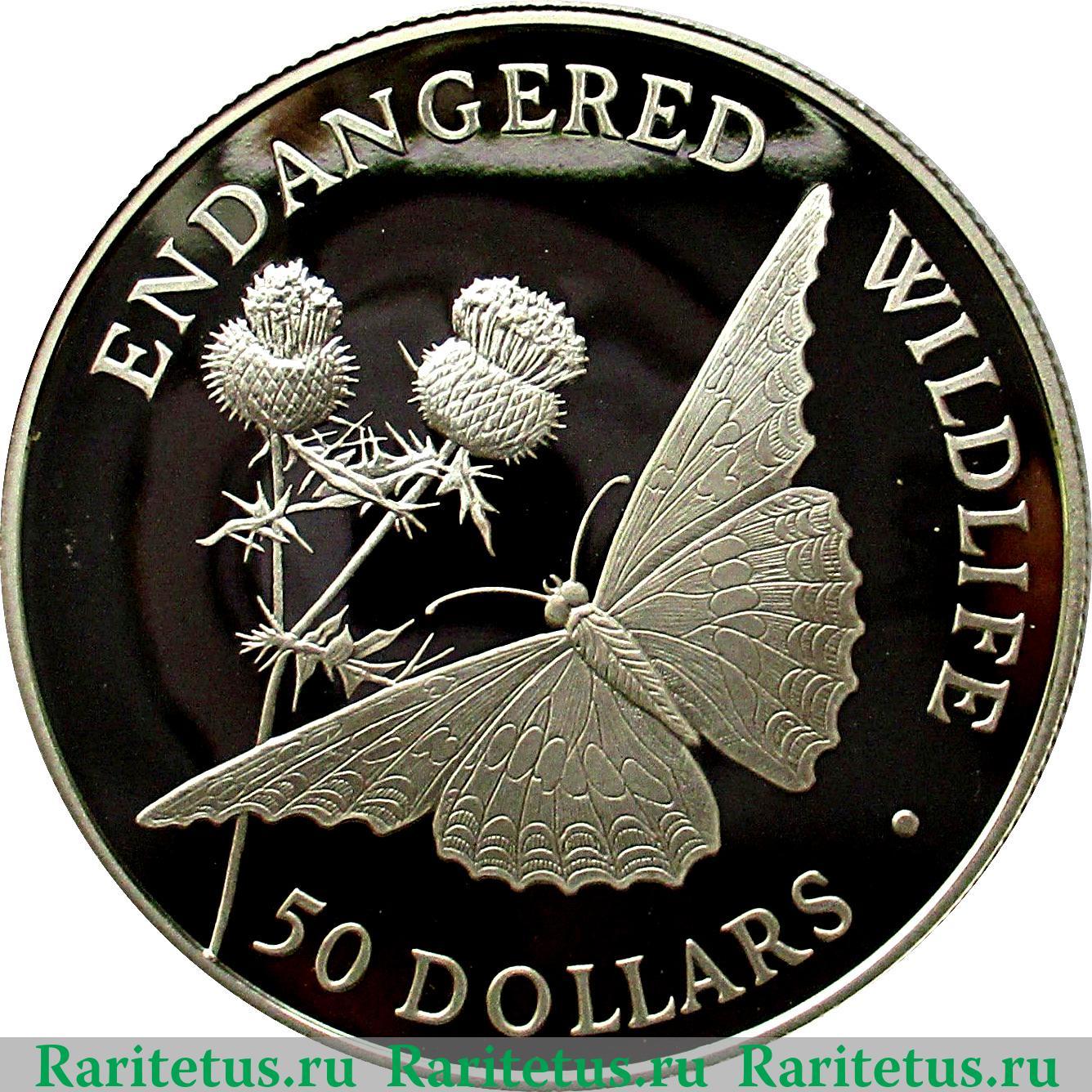 В центре изображение бабочки вида Вице-король, садящейся на куст расторопши. Сверху и справа вдоль канта надпись: «Исчезающие виды животных», на англ. яз. «ENDANGERED WILDLIFE». Снизу вдоль канта надпись на англ. языке: «50 DOLLARS.» - 50 долларов.