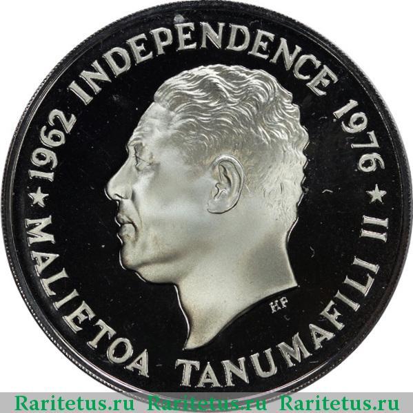 В центре изображен профильный портрет влево вождя Малиетоа Танумафили II государства Самоа и Сизифу. Под обрезом шеи инициалы медальера: «HP» - Thomas Humphrey Paget. Снизу вдоль канта имя вождя «Малиетоа Танумафили II» на ангийском языке «MALIETOA TANUMAFILI II». Сверху - год независимости от Новой Зеландии и год выпуска - «1962 INDEPENDENCE 1976». Надписи разделены пятиконечными звездами.