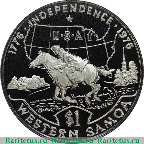 В центре на фоне карты США изображен Пол Ривер верхом на коне. Справа расположена Старая Северная церковь Христа в Бостоне, слева – дом. Сверху вдоль канта надпись «1776 INDEPENDENCE 1976» - 200 лет независимости, снизу надпись в две строки 1 доллар западное Самоа «$1 WESTERN SAMOA». Над картой пятиконечная звезда.