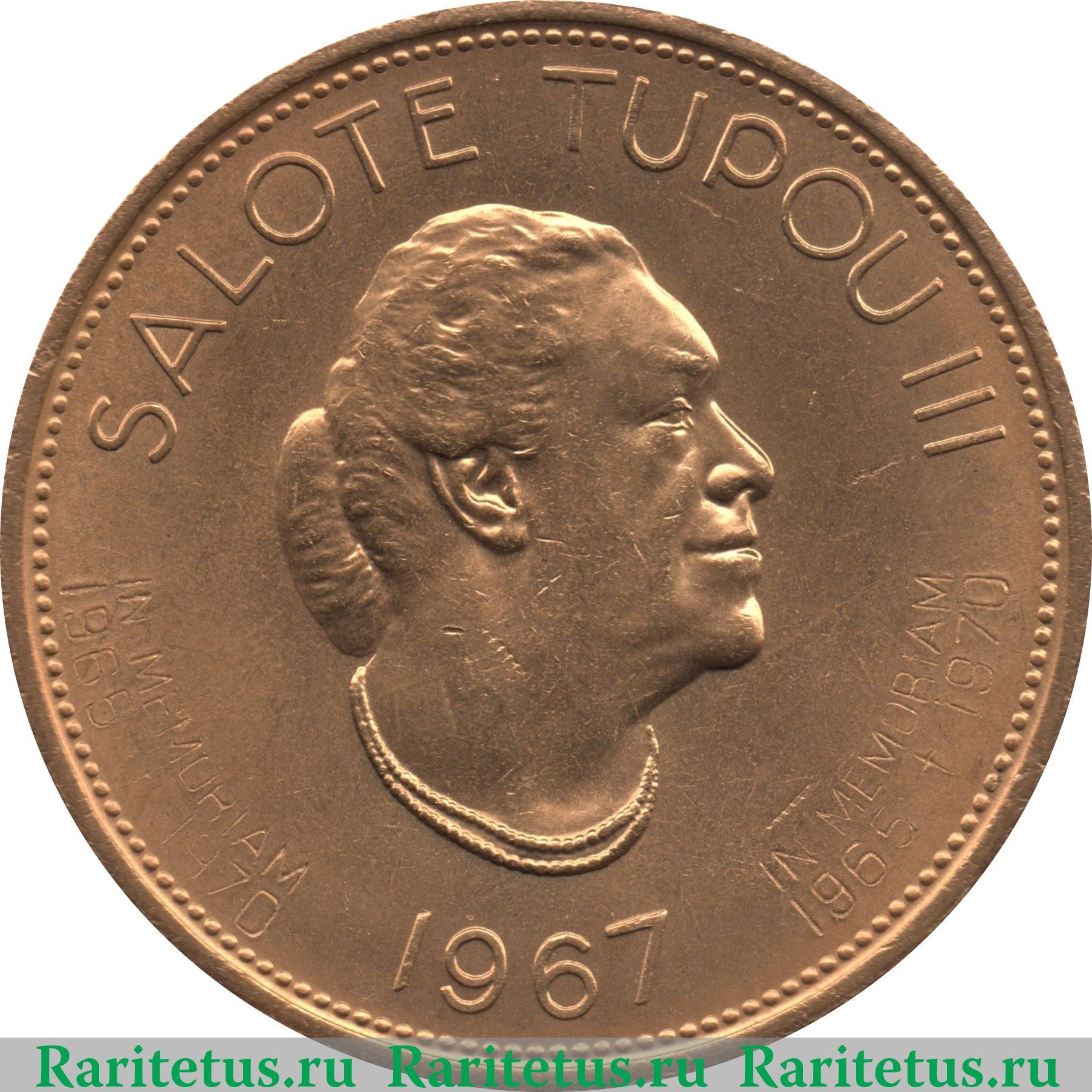 В центре - профильный портрет вправо королевы Тонга Салоте Тупоу III. Сверху вдоль канта её имя на тонганском языке: "SALOTE TUPOU III", снизу - год выпуска: "1967". Слева и справа от неё надпись в 2 строки на тонг. яз.: "IN MEMORIAM 1965 + 1970" - "В ПАМЯТЬ 1965 + 1970". По краям канта расположены рельефные элементы в виде точек.