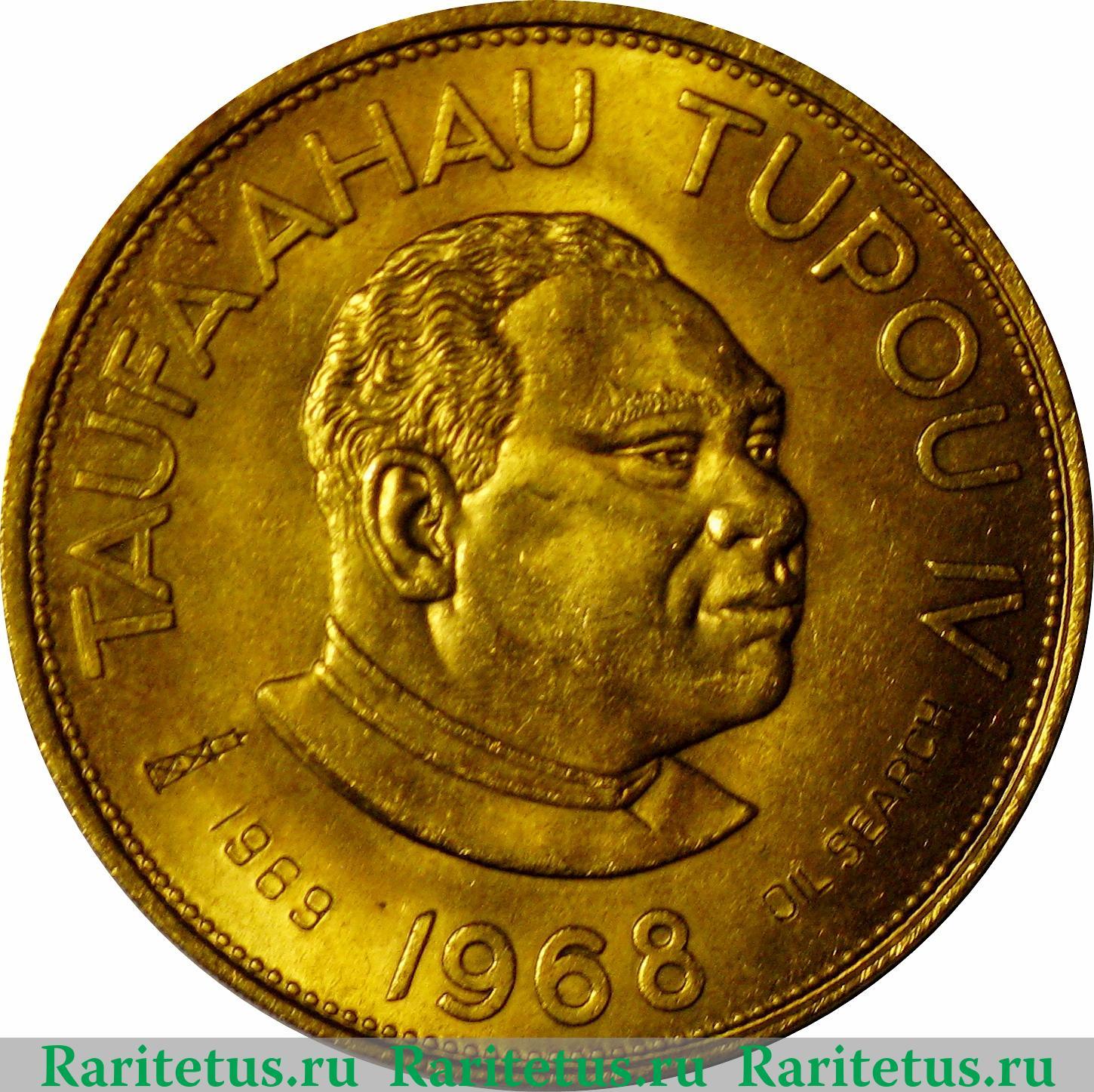 В центре изображён профильный портрет вправо короля Тонга Тауфа'ахау Тупоу IV. Сверху вдоль канта надпись на тонганском языке: "TAUFA'AHAU TUPOU IV" - "ТАУФА'АХАУ ТУПОУ IV", слева изображение вышки и дата: "1969", справа на английском: "OIL SEARCH" - "ПОИСК НЕФТИ", снизу: "1968" - год выпуска. По краям канта расположены рельефные элементы в виде зубцов.