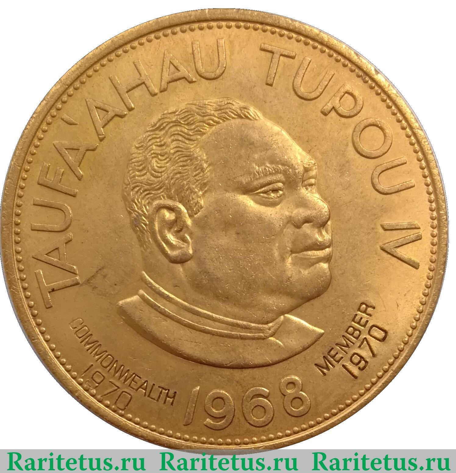 В центре изображён профильный портрет вправо короля Тонга Тауфа'ахау Тупоу IV. Вдоль канта надписи на английском языке: "TAUFA'AHAU TUPOU IV" - "ТАУФА'АХАУ ТУПОУ IV", слева: "COMMONWEALTH" - "СООБЩЕСТВО", справа: "MEMBER" - "ЧЛЕН", снизу: "1968" - год выпуска. По краям канта расположены рельефные элементы в виде зубцов.