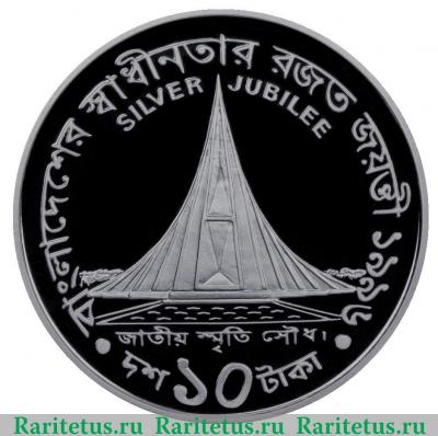 В центре изображён национальный мемориал, расположенный в городе Савар. Слева и справа от него - надпись на английском языке: "SILVER JUBILEE" - "СЕРЕБРЯНЫЙ ЮБИЛЕЙ". Вдоль канта надписи на бенгальском, слева, сверху и справа: "বাংলাদেশের স্বাধীনতার রজত জয়ন্তী ১৯৯৬" - "СЕРЕБРЯНЫЙ ЮБИЛЕЙ НЕЗАВИСИМОСТИ 1996", снизу: "দশ ১০ টাকা" - "10 ТАК".