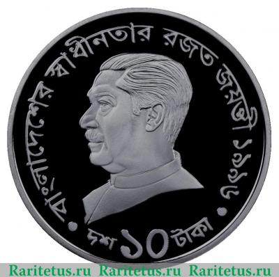 В центре профильный портрет влево президента Бангладеш Муджибура Рахмана. Вдоль канта надписи на бенгальском, слева, сверху и справа: "বাংলাদেশের স্বাধীনতার রজত জয়ন্তী ১৯৯৬" - "СЕРЕБРЯНЫЙ ЮБИЛЕЙ НЕЗАВИСИМОСТИ 1996", снизу: "দশ ১০ টাকা" - "10 ТАК"