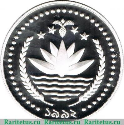 В центре изображена эмблема Бангладеш: кувшинка, слева и справа обрамлённая колосьями риса. Снизу - год выпуска в бенгальском письме: "১৯৯২" - "1992". По краям канта расположены рельефные элементы в виде кругов.