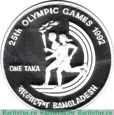 В центре изображены 2 бегуна, мужчина и женщина, несущие олимпийский огонь. Сверху вдоль канта надпись на англ. яз.: "25th OLIMPIC GAMES 1992" - "25-ые ОЛИМПИЙСКИЕ ИГРЫ 1992". Снизу название страны Бангладеш на бенгальском: "বাংলাদেশ" и английском языках: "BANGLADESH".
