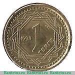 По окружности канта — рельефные элементы в виде точек. Вдоль канта — шестнадцатиугольная орнаментальная рамка. В центре — крупная цифра 1, слева от неё год выпуска «1993», справа сверху — символы «ҚҰБ» Казахстанского монетного двора, справа снизу — надпись на казахском языке «ТЕҢГЕ».