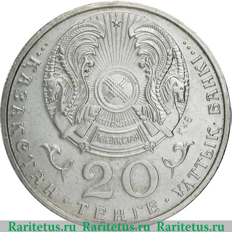 В центре государственный герб страны: шанырак (верхняя сводчатая часть юрты) в виде крестовины, вписанной в круг, от которого расходятся лучи-опоры, окружён по сторонам мифическими крылатыми конями, тулларами. Сверху между крыльями — пятиконечная звезда, снизу название страны «КАЗАКСТАН». Под гербом крупное число 20, с двух сторон выделенное рельефными национальными узорами. Справа от герба — символы «ҚҰБ» Казахстанского монетного двора.