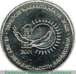 Юбилейная монета. Посвящена десятой годовщине государственной независимости Казахстана.