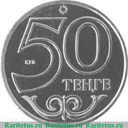 В центре стилизованная надпись «50 ТЕҢГЕ», выше изображена орнаментальная восьмиугольная розетка, под надписью — элемент национального орнамента. В цифру 5 вписаны символы Казахстанского монетного двора — «ҚҰБ».