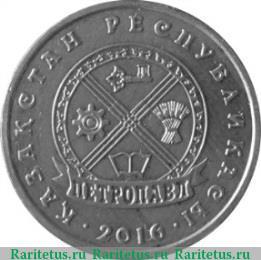 Вдоль канта название страны Республика Казахстан на казахском языке «ҚАЗАҚСТАН РЕСПУБЛИКАСЫ», снизу год выпуска «2016», с двух сторон выделен рельефными элементами в виде точек.