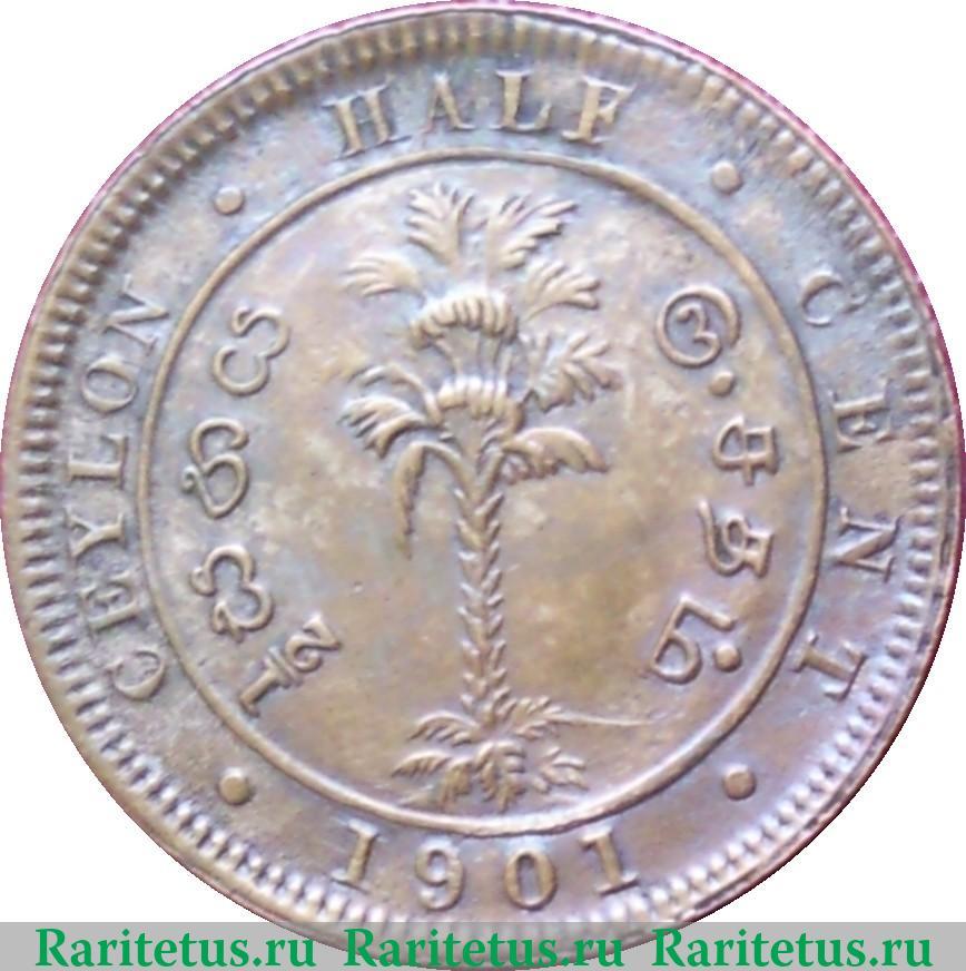 В окружности по центру пальма, по обе стороны от нее надпись «1/2 Цента»: на сенегальском «1/2 සතය» и тамильском «சதம்» языках. По окружности надписи на английском языке: слева название колонии «CEYLON» (Цейлон), сверху и слева «HALF CENT» (Пол цента) снизу год выпуска «1901». Вдоль канта элементы в виде зубцов.