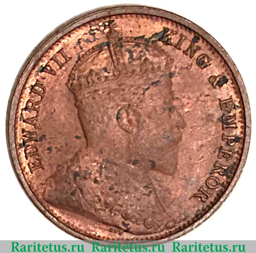 В центре изображен профильный портрет вправо короля Великобритании Эдуарда VII в короне. Вдоль канта надписи на английском языке: слева имя монарха «EDWARD VII» (Эдуард VII), справа - титулы «KING & EMPEROR» (король и император). Под срезом знак британского медальера Джорджа Вильяма де Соллеса - «Des.» По окружности канта элементы в виде зубцов.