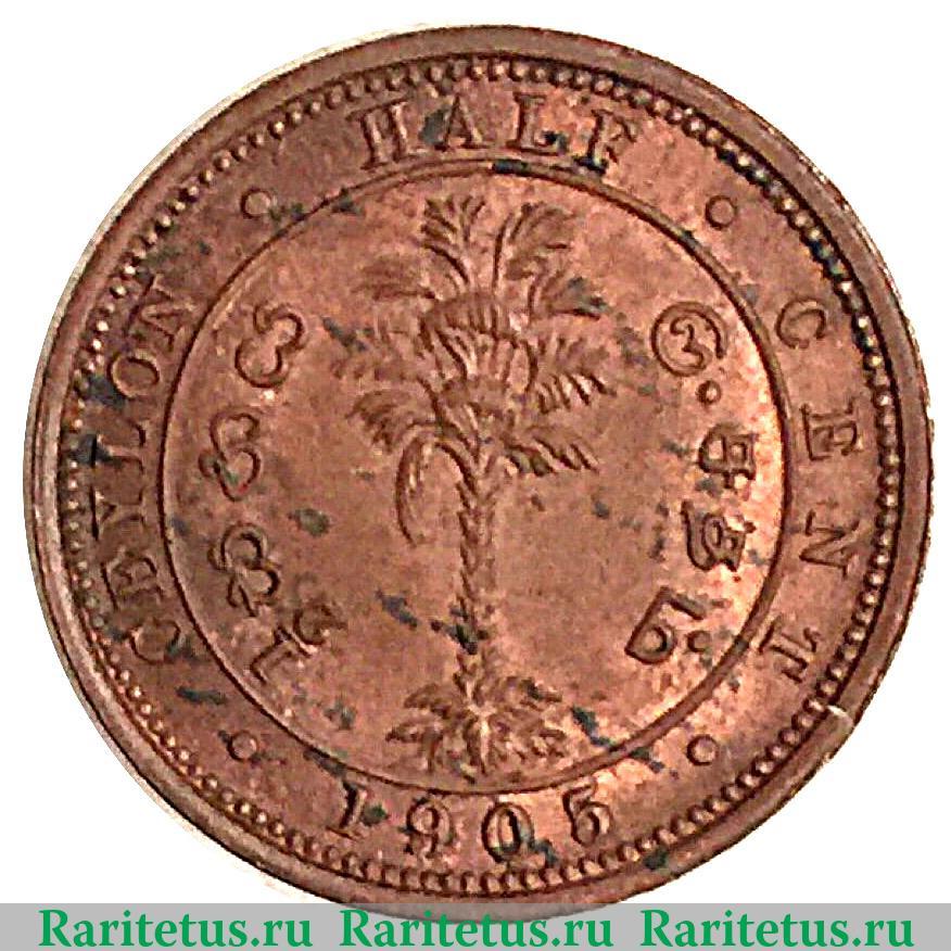 В окружности по центру пальма, по обе стороны от нее надпись «1/2 Цента»: на сенегальском «1/2 සතය» и тамильском «சதம்» языках. По окружности надписи на английском языке: слева название колонии «CEYLON» (Цейлон), сверху и слева «HALF CENT» (Пол цента) снизу год выпуска «1905». Вдоль канта рельефные элементы в виде точек.