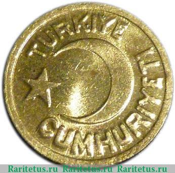 Сверху, справа и снизу вдоль канта надпись на турецком языке: "TÜRKİYE CUMHURİYETİ" - ТУРЕЦКАЯ РЕСПУБЛИКА". В центре изображён герб страны - полумесяц со звездой.
