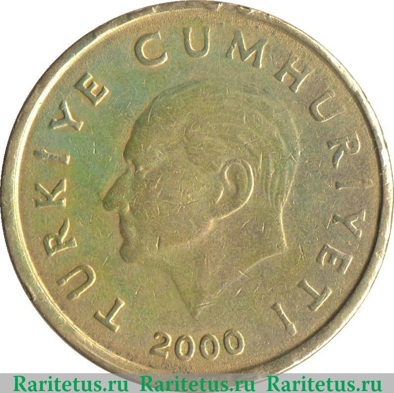 Слева, сверху и справа вдоль канта надпись на турецком языке: "TÜRKİYE CUMHURİYETİ" - ТУРЕЦКАЯ РЕСПУБЛИКА". В центре - профильный портрет влево Мустафы Кемаля Ататюрка. Снизу - год выпуска: "2000".
