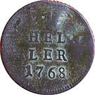 По центру надпись в три строки «1 HELLER», ниже год выпуска «1768∙». По окружности канта рельефные элементы в виде зубцов.