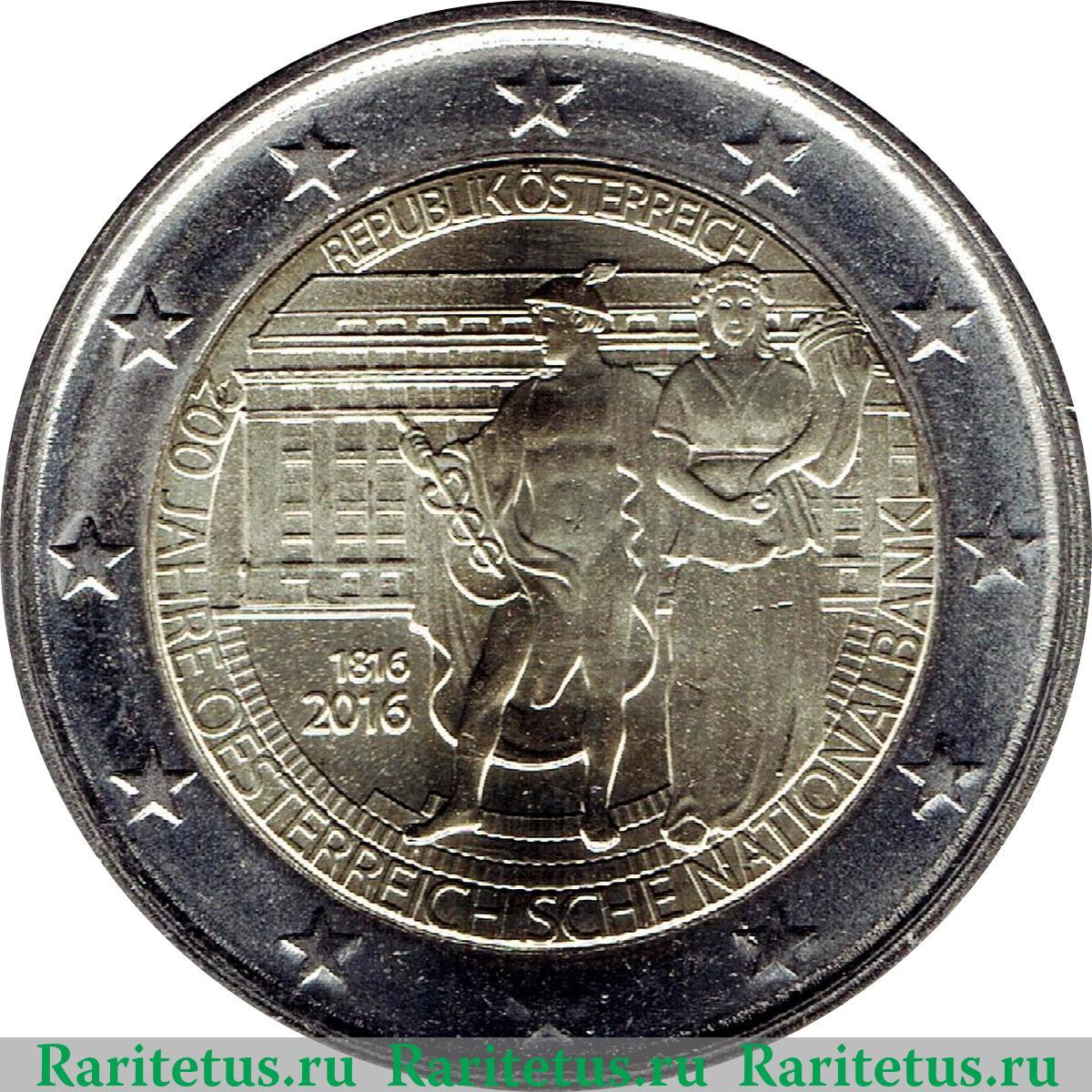 На внутреннем диске, на фоне здания Национального банка изображены скульптуры – Меркурия, с посохом и Фортуны с рогом изобилия, высеченных на барельефе портала главного входа в банк. Слева годы: основания банка «1816» и год выпуска «2016». По окружности диска надписи на немецком языке: сверху название страны «REPUBLIK ÖSTERREICH» (Республика Австрия), слева, снизу и справа тема выпуска «200 JAHRE OESTERREICHISCHE NATIONALBANK» (200 лет Национальному банку Австрии). По окружности вдоль канта двенадцать пятиконечных звезд.